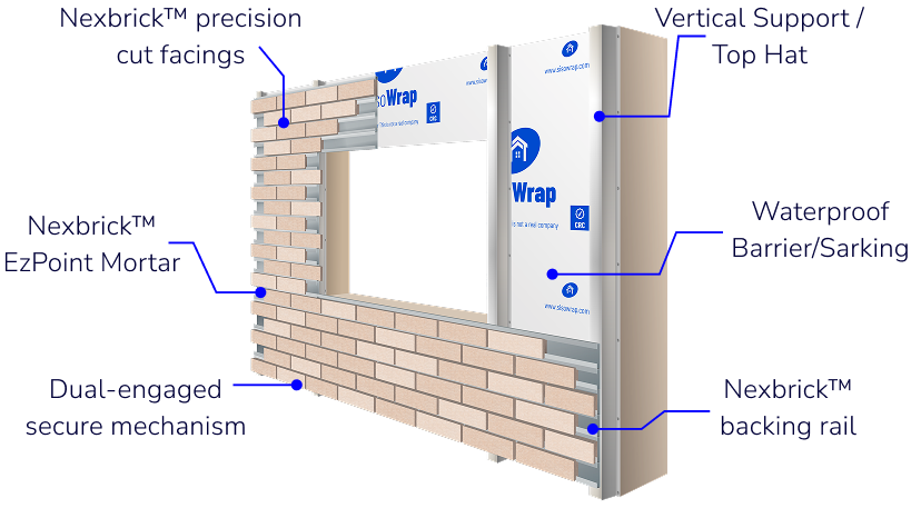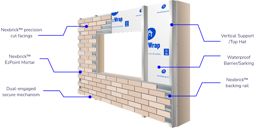 Nexbrick™ by Modular Masonry Group is a lightweight, mechanically fixed brick facade system using 25 mm real brick facings mounted to an Australian-made dual-engagement steel rail.